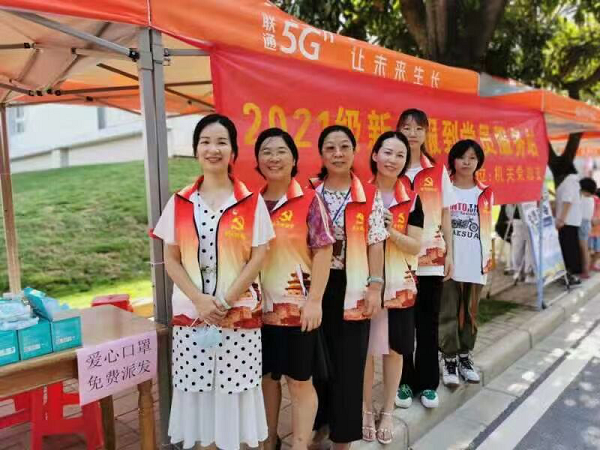 尽管天气炎热,但却阻挡不了工作人员的服务热情,他们穿上党员志愿服,佩戴党徽、口罩,时而热情主动为新生和家长送上口罩和矿泉水,时而热情地答疑解惑,帮助他们顺利地完成手续办理。