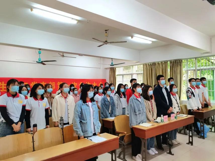 会议伊始,全体成员起立,奏唱国歌。主持人刘韩对支部构架与支部情况进行了介绍。