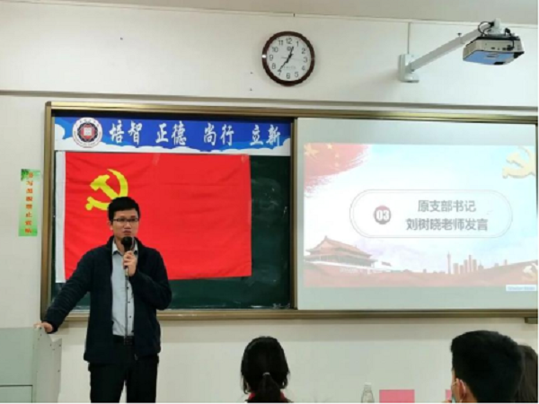 接着,由原支部书记刘树晓老师总结上任以来支部发展状况并给予寄语。重点强调支部成员需秉承“实干、担当”的精神,用党的先进理论武装头脑,也希望支部在本学期能够将党史学习教育落实到位,推动党史学习教育融入日常生活,融入到“三会一课”当中;同时表示会一如既往地关注支部情况,期待着支部的发展更上一层楼。