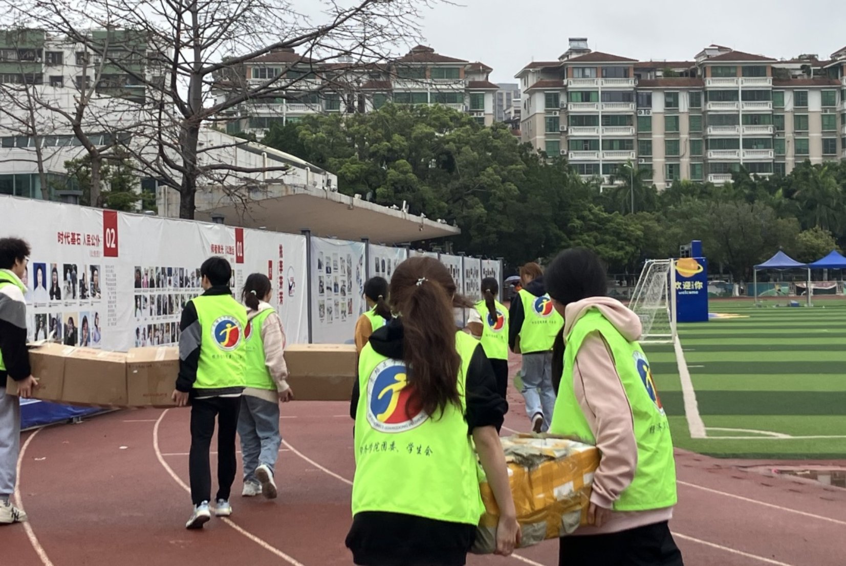 3月29日下午,志愿者们齐聚邝维煜中学,参加活动前培训。搬运物资、分工、定点、彩排,每一项都有条不紊进行。尽管细雨蒙蒙,凉风阵阵,志愿者们仍心揣热忱,全心全意为明天的活动做好准备工作。