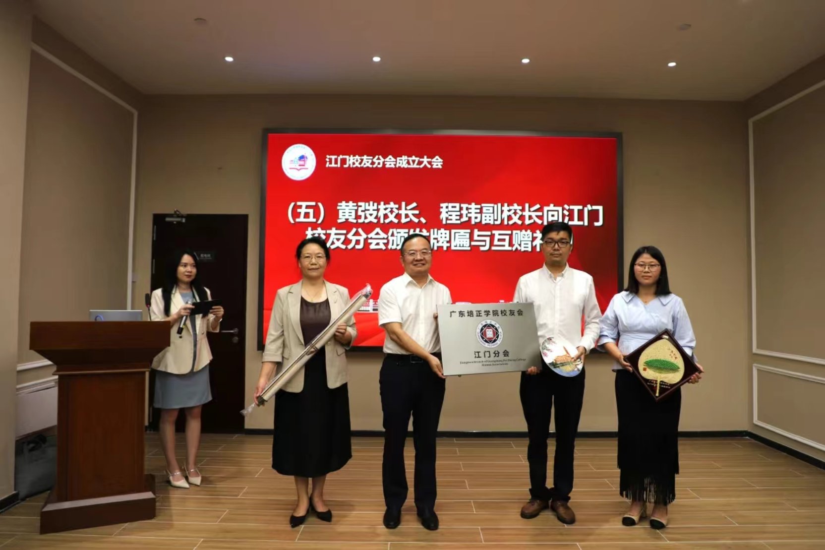 紧接着,黄弢校长、程玮副校长向江门校友分会颁发分会牌匾并与江门校友分会代表张德明理事长、文玉莹秘书长互赠礼物。邓惠校长助理向江门校友分会授会旗并颁发江门校友分会第一届理事会成员聘书。江门校友分会张德明理事长上台作分会筹备工作及第一届理事会工作规划报告。