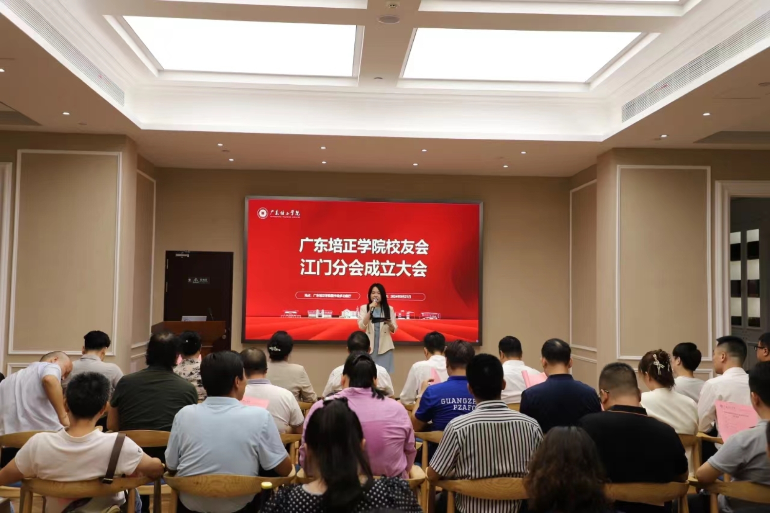 本网讯(招生就业与继续教育处 林佳锋)9月21日,广东培正学院校友会江门分会成立大会在图书馆多功能室隆重举行。学校校长黄弢、副校长程玮、校长助理邓惠、各主要职能部门领导、二级学院书记党委书记以及江门、广州、佛山、惠州、东莞、湛江、珠海等地区理事长及校友代表欢聚一堂,共同见证这一激动人心的时刻。会议由李晓瑜校友主持。