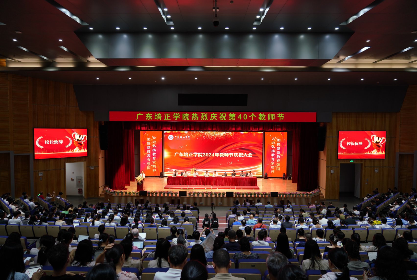 本网讯(校办 娄雯)9月11日下午,学校在学校礼堂隆重集会,庆祝第40个教师节。董事会和学校领导出席庆祝大会,黄弢校长致辞,高香林副校长主持,全体中层干部、专任教师、辅导员、领奖代表等900余人参加会议。