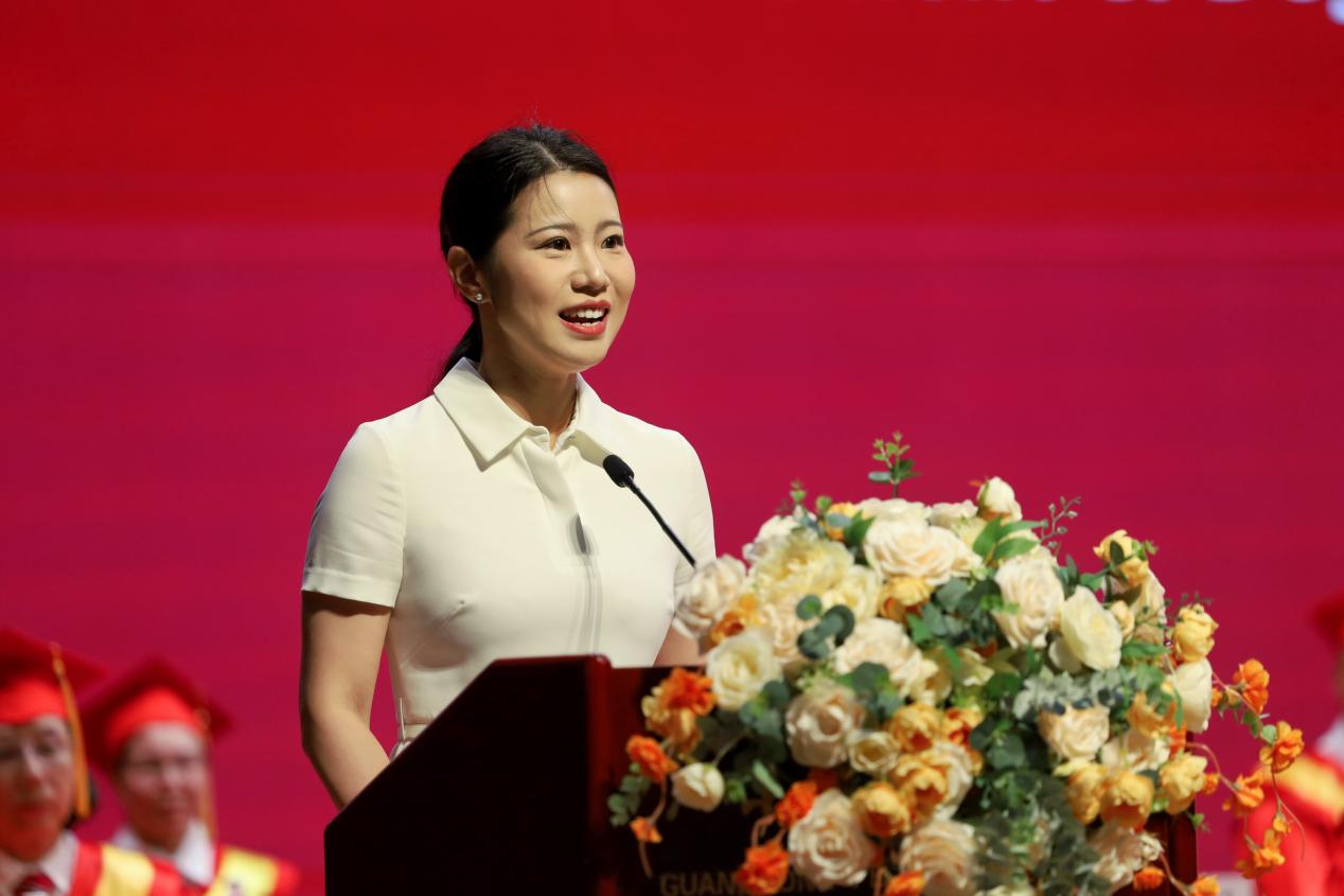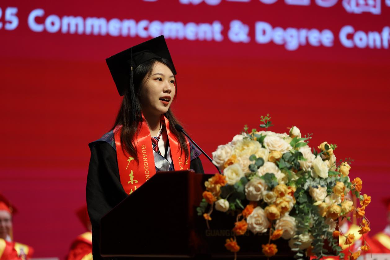 赖薇同学回顾四年前来自不同城市的同学们怀揣梦想步入校园,如今在母校见证下从青涩走向成熟,课堂积累知识、实践磨炼能力、失败中学会成长,善衡图书馆的夜读、史带教学楼的讨论等点滴都是人生积淀。她感恩母校搭建成长平台助其获国家奖学金并考上香港理工大学研究生,也感谢老师引领、同学陪伴。她表示毕业是新开始,未来虽有挑战,但大家已具备面对的勇气,愿同学们心怀热爱走所选道路,还祝愿母校、师长更好,毕业生不负青春奔赴远方。
