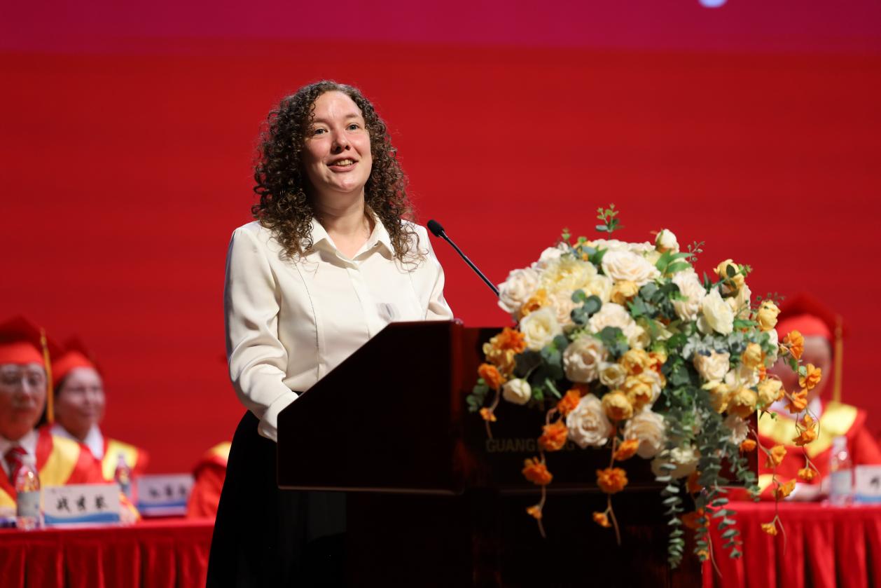 随后,副校长高香林宣读 2025 届毕业生表彰决定。中籍教师代表、数据科学与计算机学院教师马昕瑶,外籍教师代表Rhona,毕业生代表、管理学院2025届工商管理3班赖薇分别发言。