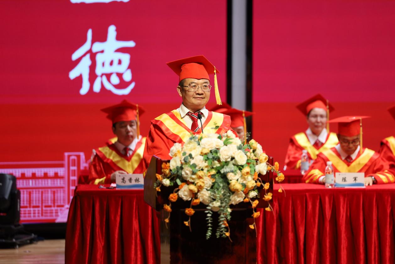 校长黄弢以“青春作舟,逐梦未来”为题致辞。黄弢校长首先对圆满完成学业的全体毕业生、支持他们的家人、辛勤培育的师长以及莅临典礼的来宾表达了祝贺、感谢与欢迎。