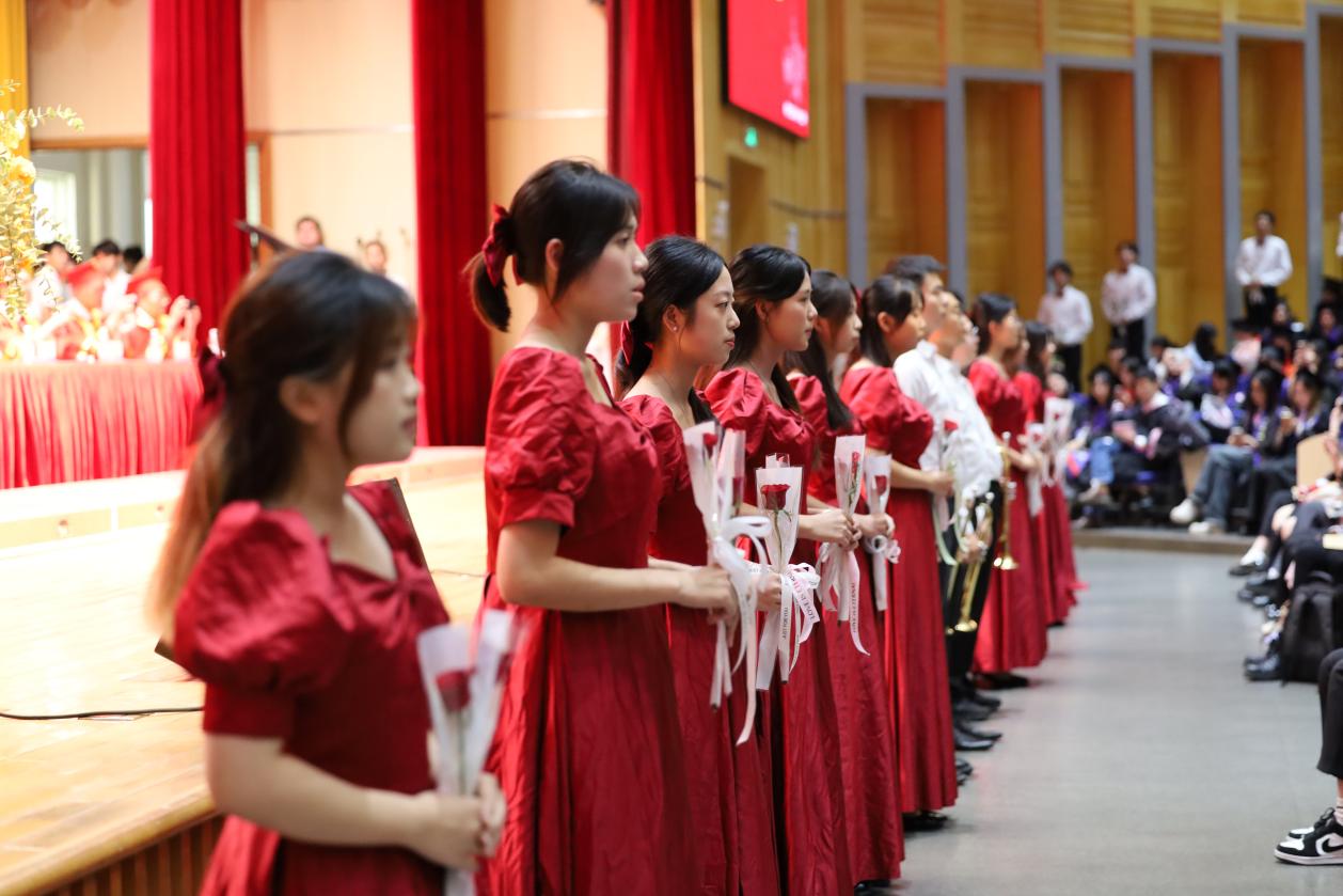 校董事会领导和学校领导向通过2025年硕士研究生考试并被录取的同学颁发梁尚立基金奖,同时为2025届一级荣誉生颁奖。毕业生们依次上台,接受学士学位授予仪式(拨穗仪式)。仪式后,一群红裙少女与白衫少年手持鲜花演唱《友谊地久天长》,随着歌声渐歇,鲜花赠予毕业生,毕业典礼在感动与希望中圆满落幕。