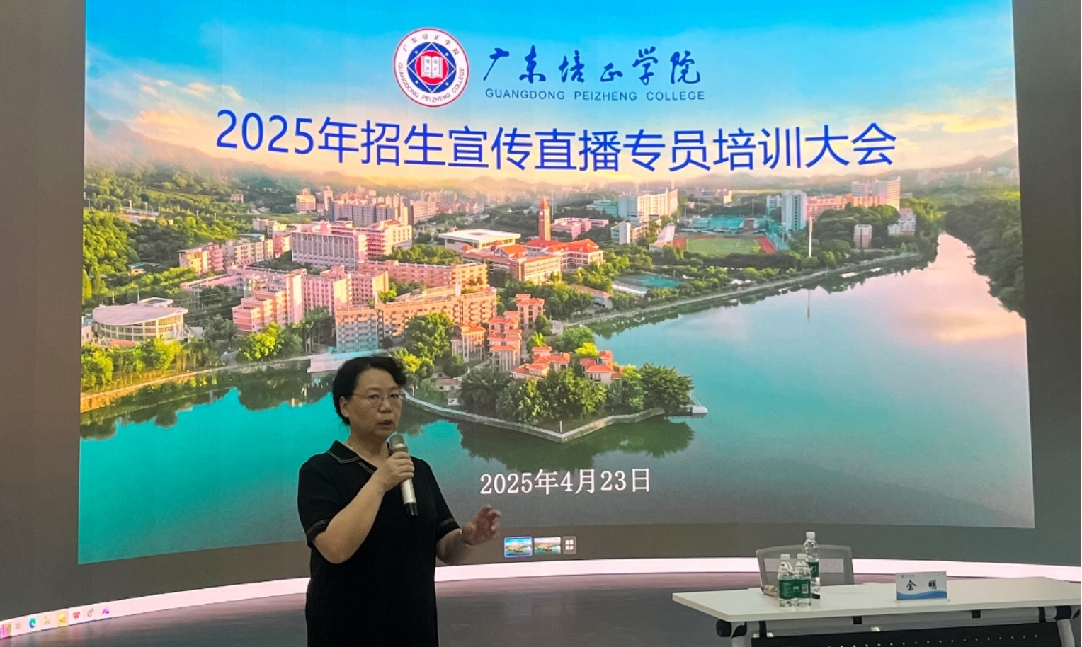 程玮副校长在观摩培训后作总结讲话。她充分肯定本次培训的实效性,感谢华南农业大学招生宣传专家的专业指导,并强调:"招生宣传是连接学校与社会的重要窗口,直播作为新媒体时代的关键载体,既要展现办学实力,更要传递育人温度”。她同时指出,全体专员应以此次培训为契机,创新思维、强化协作,共同构建多层次、立体化的招生宣传矩阵,为学校高质量发展注入新动能。