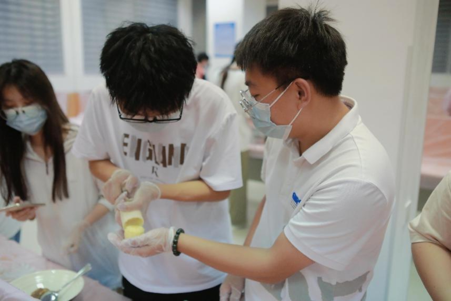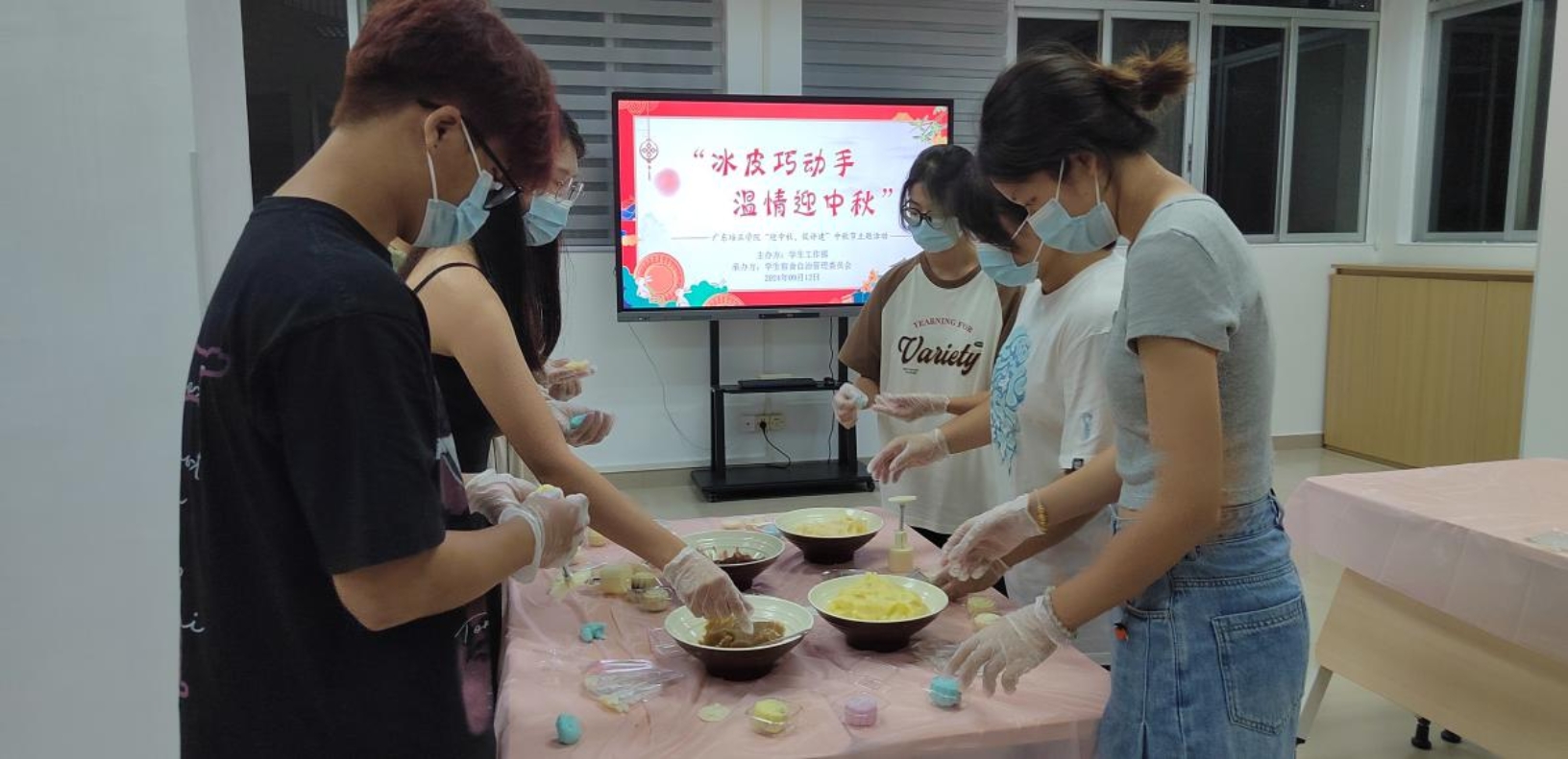 到了晚上,同学们带着喜悦和期待的心情早早就来到“一站式”学生社区服务中心,工作人员热情地引导同学们到月饼制作区域,为同学们发放了口罩和手套,并介绍了制作冰皮月饼的流程和注意事项,接着同学们纷纷开始尝试起来,他们相互帮助、交流着制作冰皮月饼的经验,现场欢乐气氛浓烈,笑声不断。