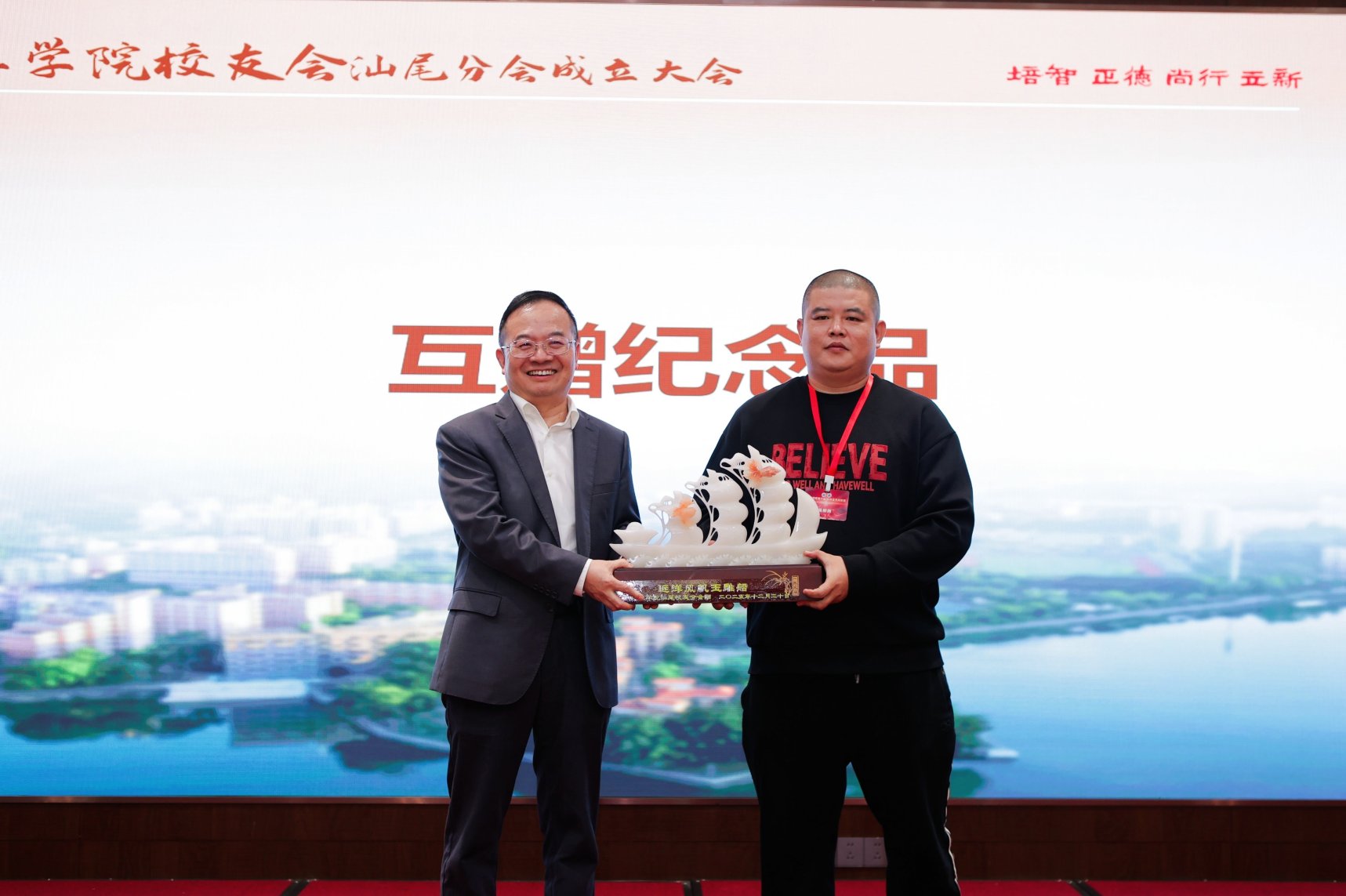 在全场见证下,仪式环节有序推进:程玮副校长为汕尾分会颁发牌匾与会旗;数据科学与计算机学院党委书记、校友总会副会长刘远辉,会计学院党委书记、校友总会副会长陈双红代表校友总会,为汕尾分会理事会成员颁发聘书;校领导与分会代表互赠纪念礼品,以信物承载校友情、凝聚母校情,传递双向牵挂的深厚情谊。