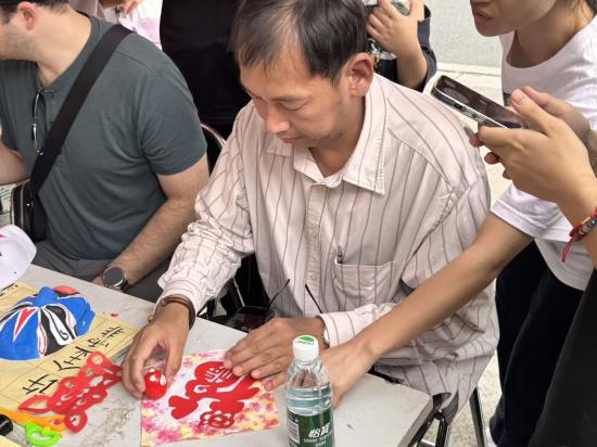 剪纸体验区同样热闹非凡。红纸、剪刀在师生手中翻飞,转眼间,栩栩如生的窗花和寓意吉祥的福字便跃然纸上。来自日本的村上老师对剪纸艺术充满好奇,在学生志愿者的帮助下,他尝试剪出简单的“福”字图案。“看似简单的折叠和裁剪,却能创造出这么精美的作品,太神奇了!” 他感慨道。一张张色彩鲜艳的剪纸作品,成为跨文化创意碰撞的见证。
