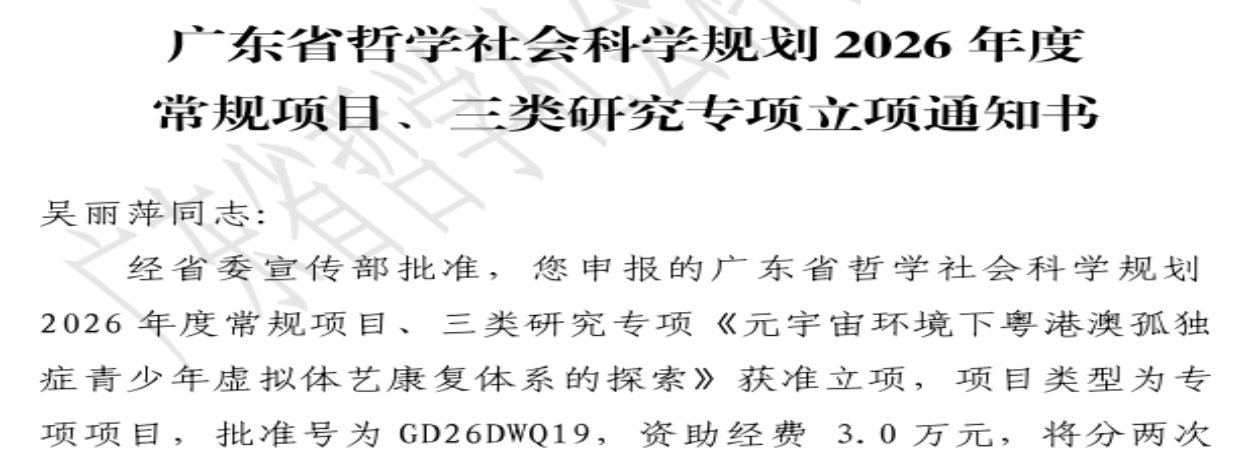 本网讯(体育学院 钟小翠)近日,广东省哲学社会科学规划领导小组办公室正式公布2026年度专项课题立项结果,恰逢“十五五”规划开局之年,我校体育学院吴丽萍老师申报的课题《元宇宙环境下粤港澳孤独症青少年虚拟体艺康复体系的探索》(课题批准号:GD26DWQ19)成功获批“大亚湾区专项”立项,既是学校体育学院省部级哲学社会科学研究领域的重大突破,更是开局之年聚焦国家战略、深耕民生科研的亮眼成果。