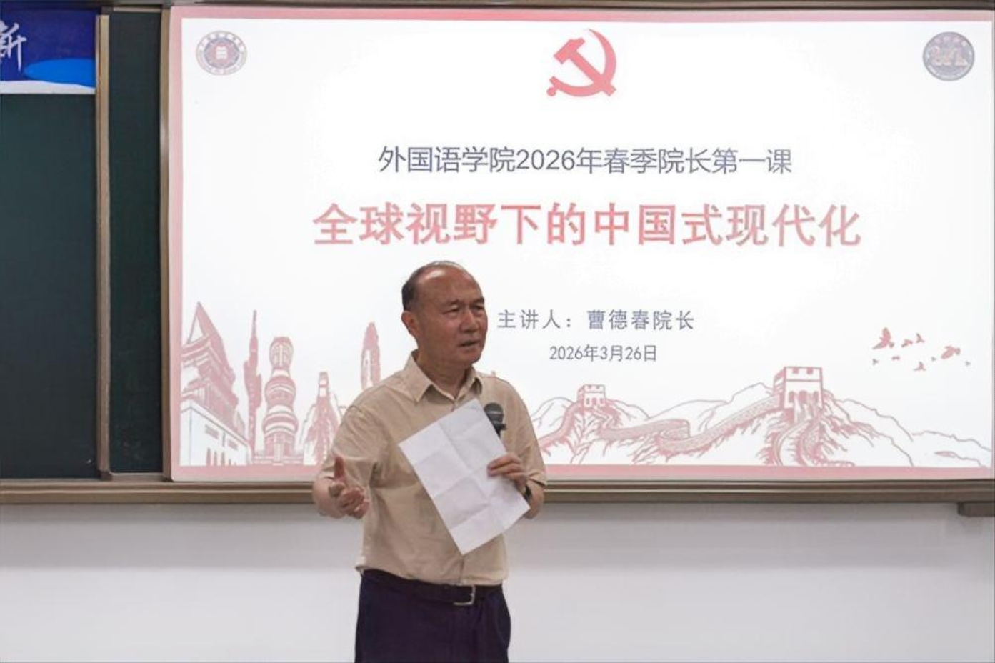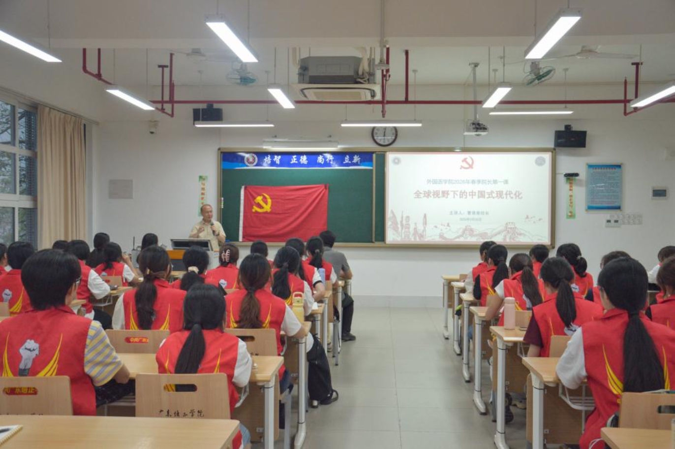 本网讯(外国语学院 章小慧)为深入落实立德树人根本任务,引导青年学子坚定理想信念、锤炼过硬本领、勇担时代使命,3月26日,我校外国语学院2026年春季学期“思政第一课”在第五教学楼105课室顺利开展。外国语学院院长曹德春以“全球视野下的中国式现代化”为主题,结合自身经历与全球发展格局,从历史纵深、制度优势、改革路径等多个维度,深入解码中国发展奇迹的核心密码,为全体入党积极分子带来了一堂有高度、有温度、有力度的思政课。