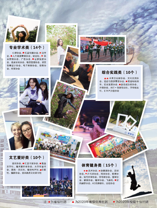 近年来我校学生社团蓬勃发展,规模不断壮大,学生社团已发展至49个,会员4500余人;社团体制机制日益健全,条件保障逐渐完善,先后出台了社团指导教师、社团管理规定等制度,社团作用发挥明显,育人价值日益凸显,以“社团文化节”和“周末文化广场”活动为载体,推动学生社团多元化发展,社团文化节已连续开展12年、周末文化广场连续开展9年,校级活动年均30多项、参与人数年均30000多人次。2014年以来,先后荣获集体荣誉60多项、个人奖项300多项,其中6个学生社团获得“广东省优秀学生社团”,武术协会获得“2014年全国百佳体育公益社团”,为繁荣校园文化和推进校园精神文明建设作出了积极贡献。