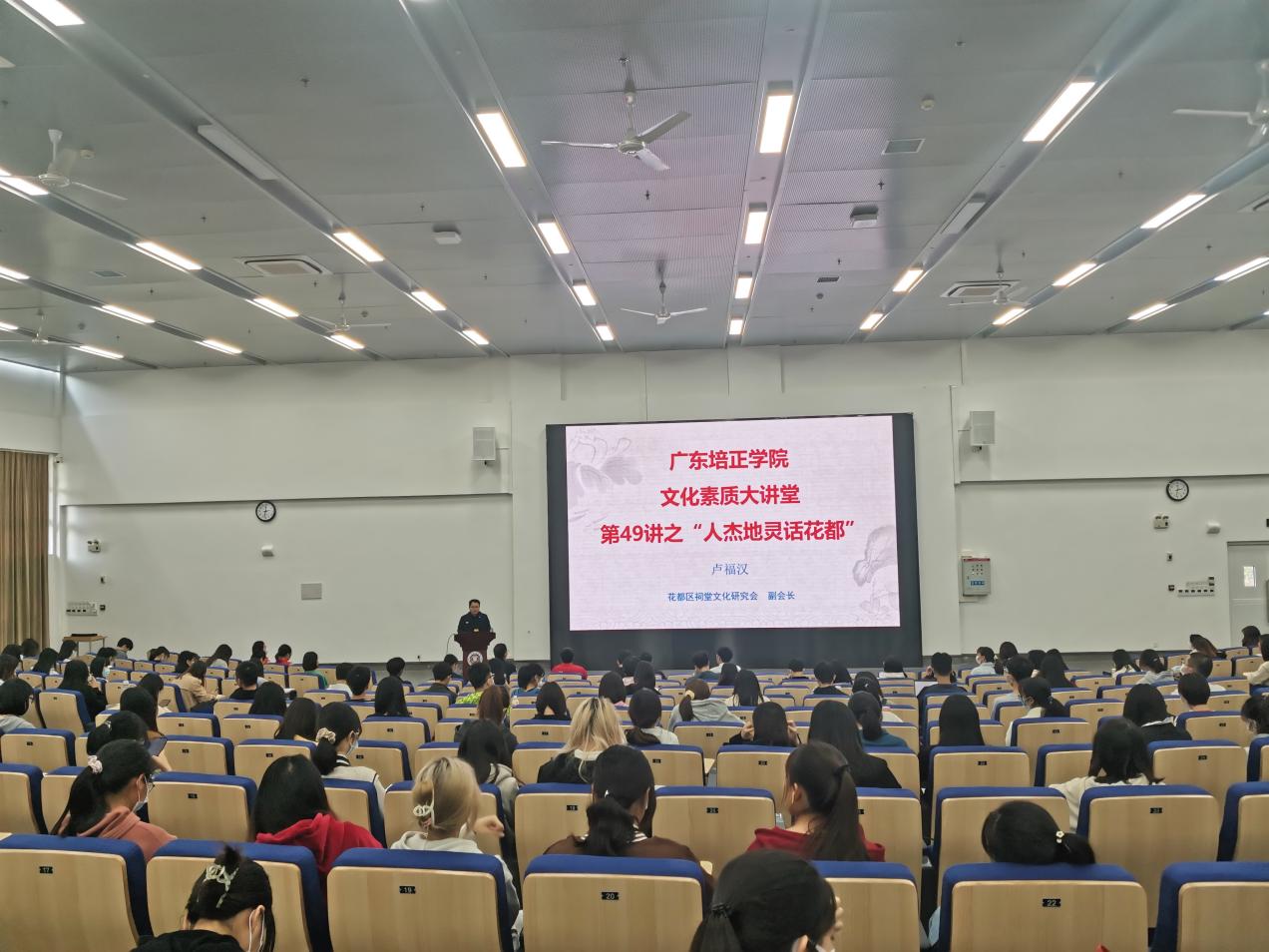 本网讯(人文学院 唐诗杰)2021年12月10日下午,由校园文化建设委员会主办、人文学院学生党支部承办的文化素质教育大讲堂第49讲在5108学术报告厅举行。本次文化素质大讲堂特别邀请花都区祠堂文化研究会副会长卢福汉作为主讲人,以培正学院所在的赤坭为重点,宣传介绍花都的建置历史、古村落文化及历史文化名人。